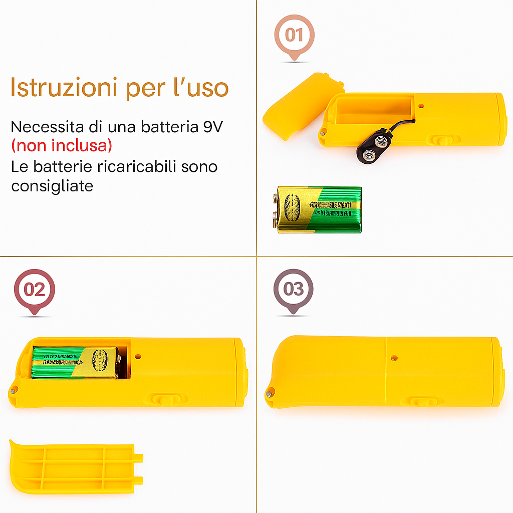 Non è semplicemente un repellente per cani! Grazie alla luce LED integrata, può essere utilizzato anche come torcia durante le tue passeggiate serali. Doppia funzionalità in un unico dispositivo intelligente